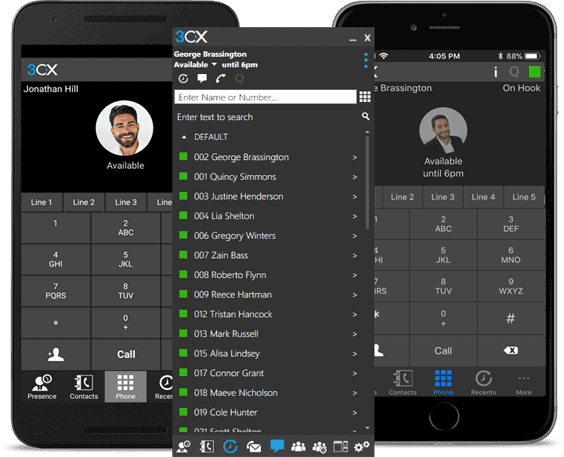 3CX includes an iPhone and Android client that allows you to make and receive office calls on the go, whilst using their office number as their caller ID.
